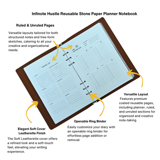 Infinote Hustle Reusable Stone Paper Smart Notebook and Planner B5 Cover with A5 Pages, Planner, Ruled & Unruled Sections, Eco-Friendly & Erasable, Ideal for Notes, Goals, & Organization ( 96 Pages | 48 Sheets | 48 Sides, Tan Brown,71)