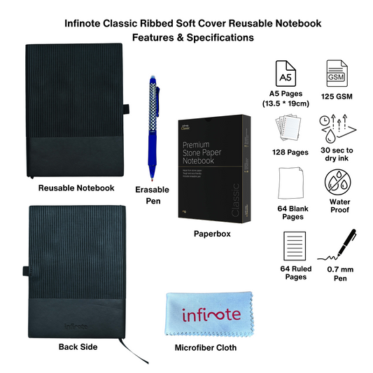 Infinote Leatherette Ribbed Soft Cover Classic Stone Paper Notebook – Water-Resistant, Eco-Friendly, Half-Ruled & Half-Unruled Pages, with Pen Holder & Back Pocket